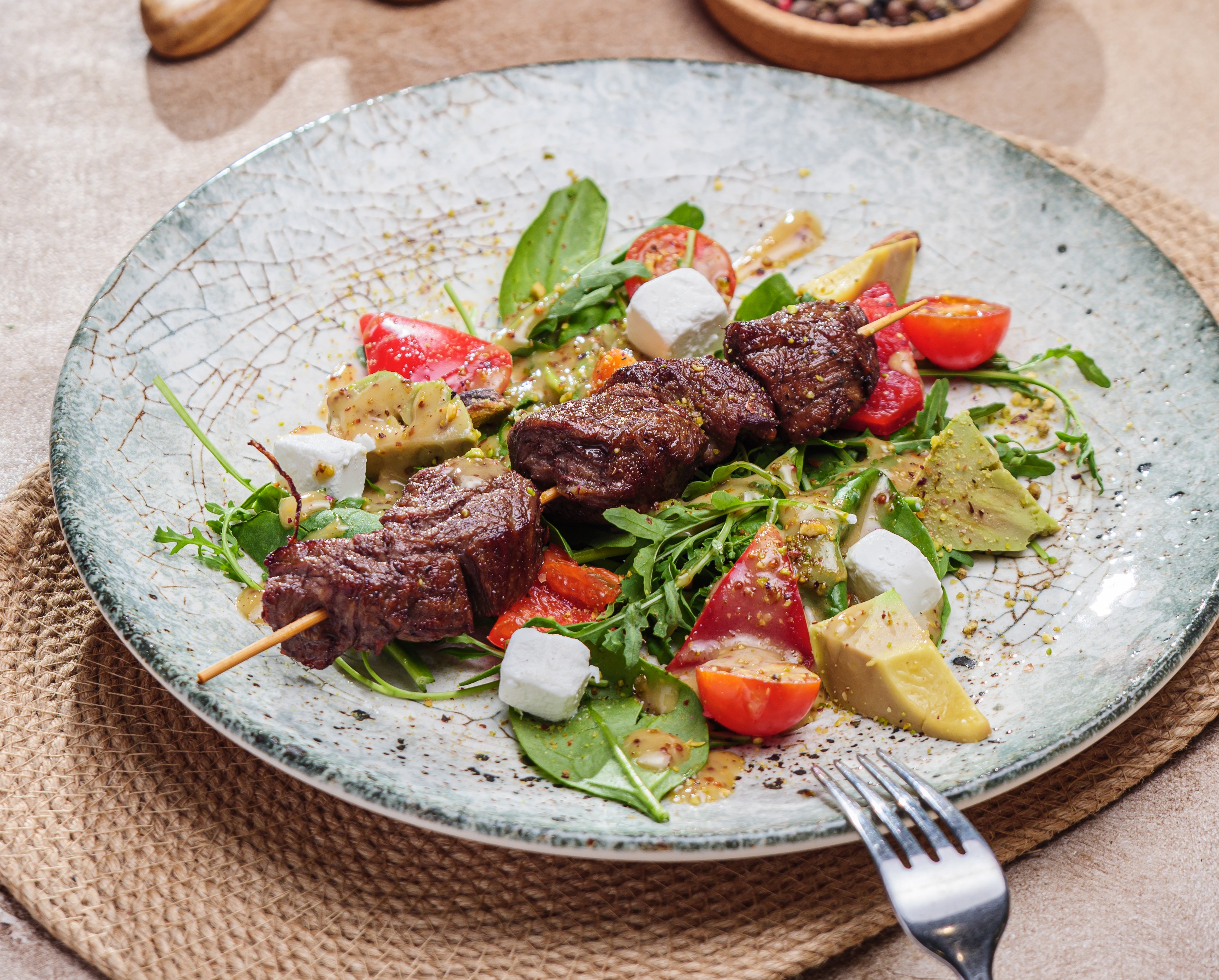 сочные кусочки филе говядины, баранины и курицы, люля-кебаб с овощами гриль: баклажаны, кабачки, болгарский перец, шампиньоны, молодой картофель, жаренный лук (время приготовления от 1 часа)