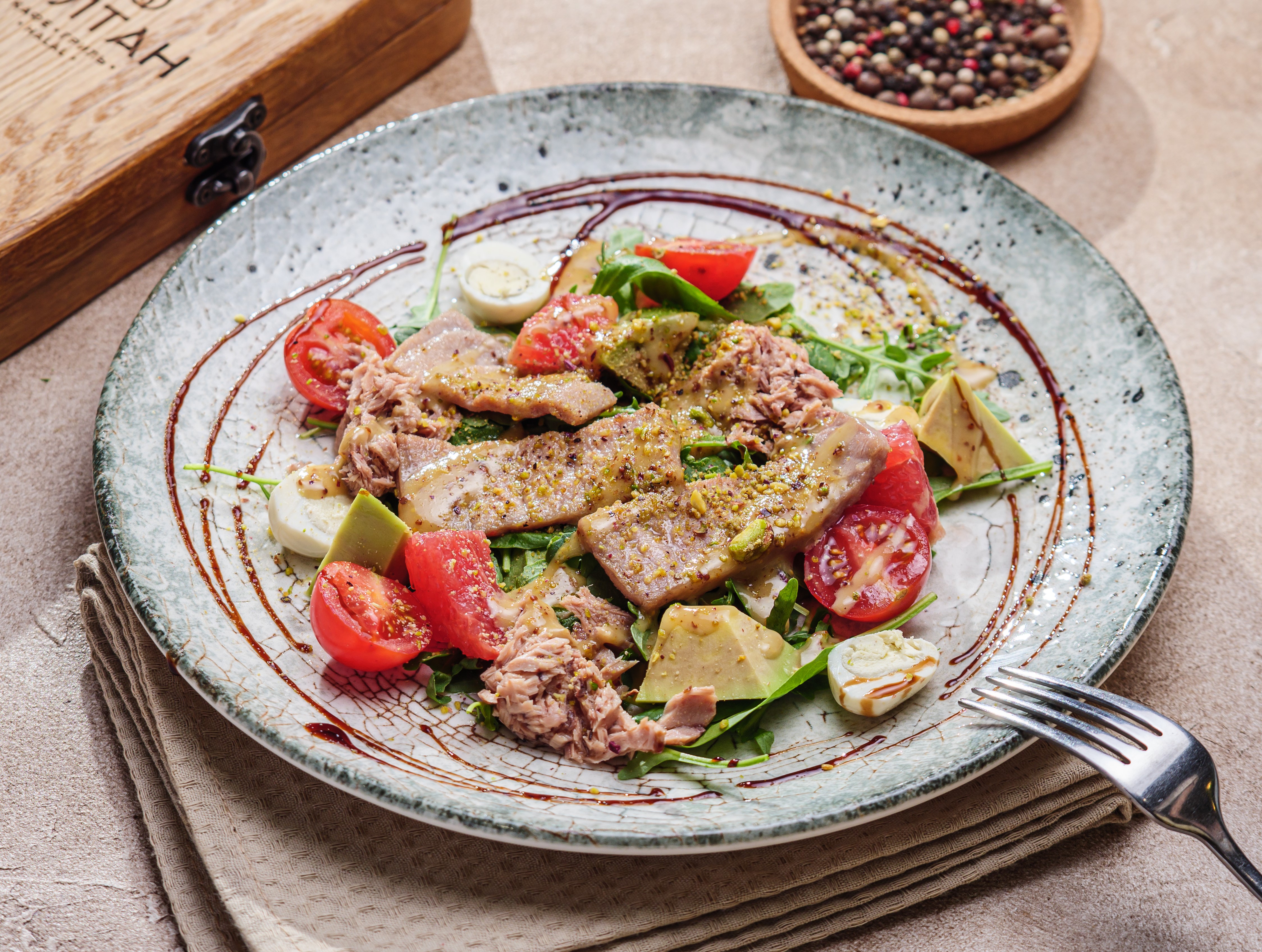 филе утки, томленая груша, авокадо, микс салата, медово-горчичный соус