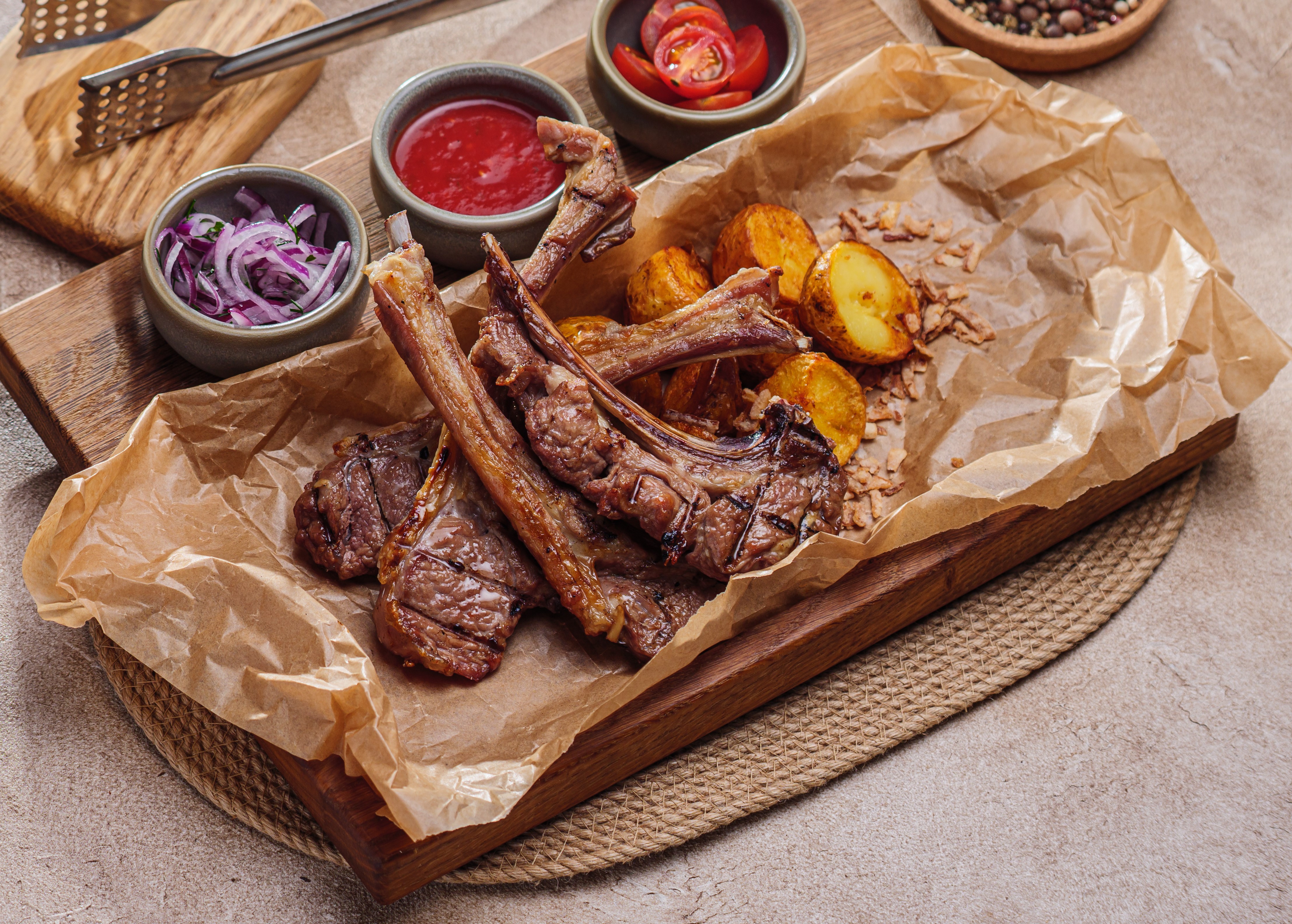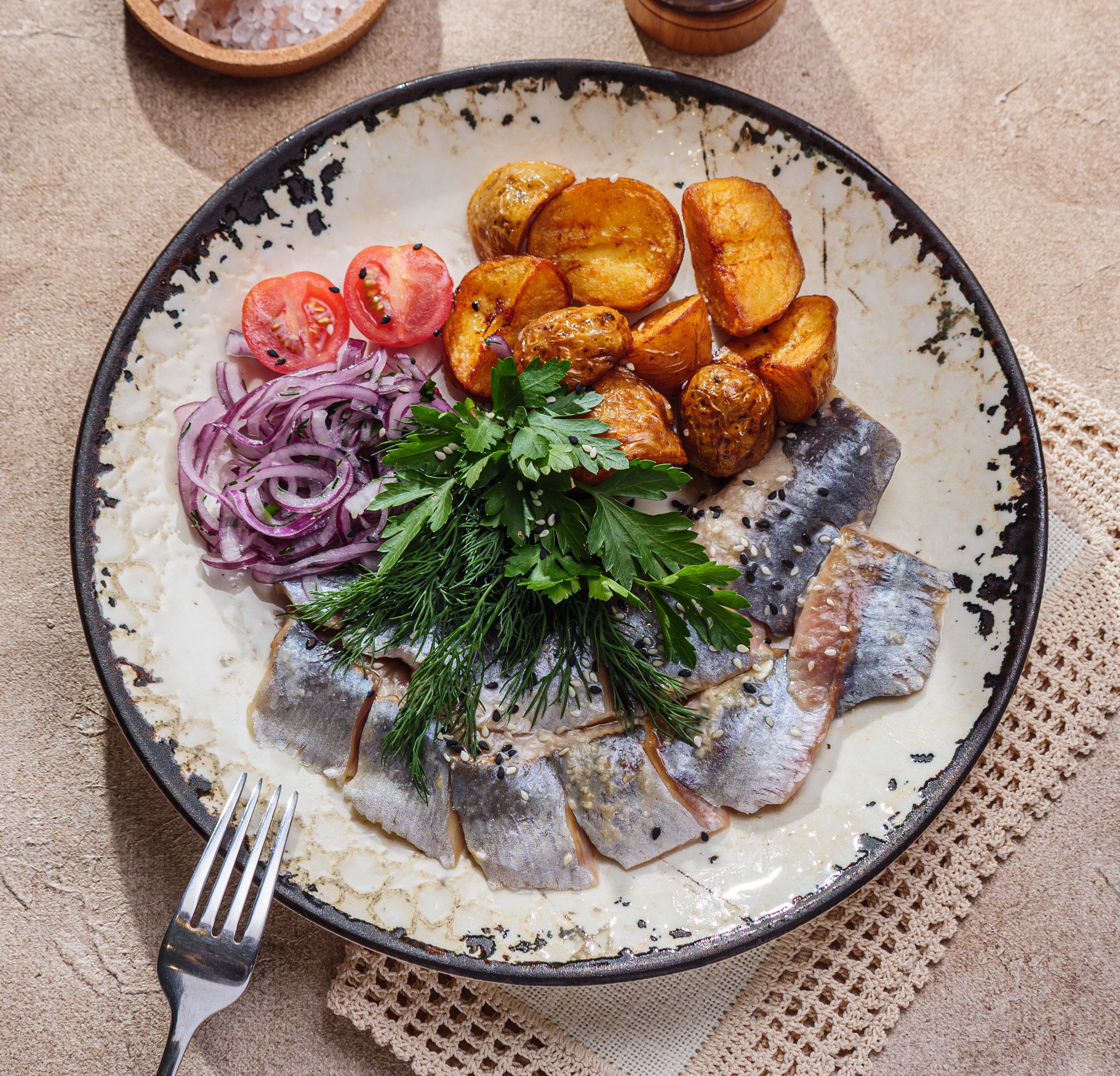 подаётся с молодым картофелем, маринованным луком и томатным соусом