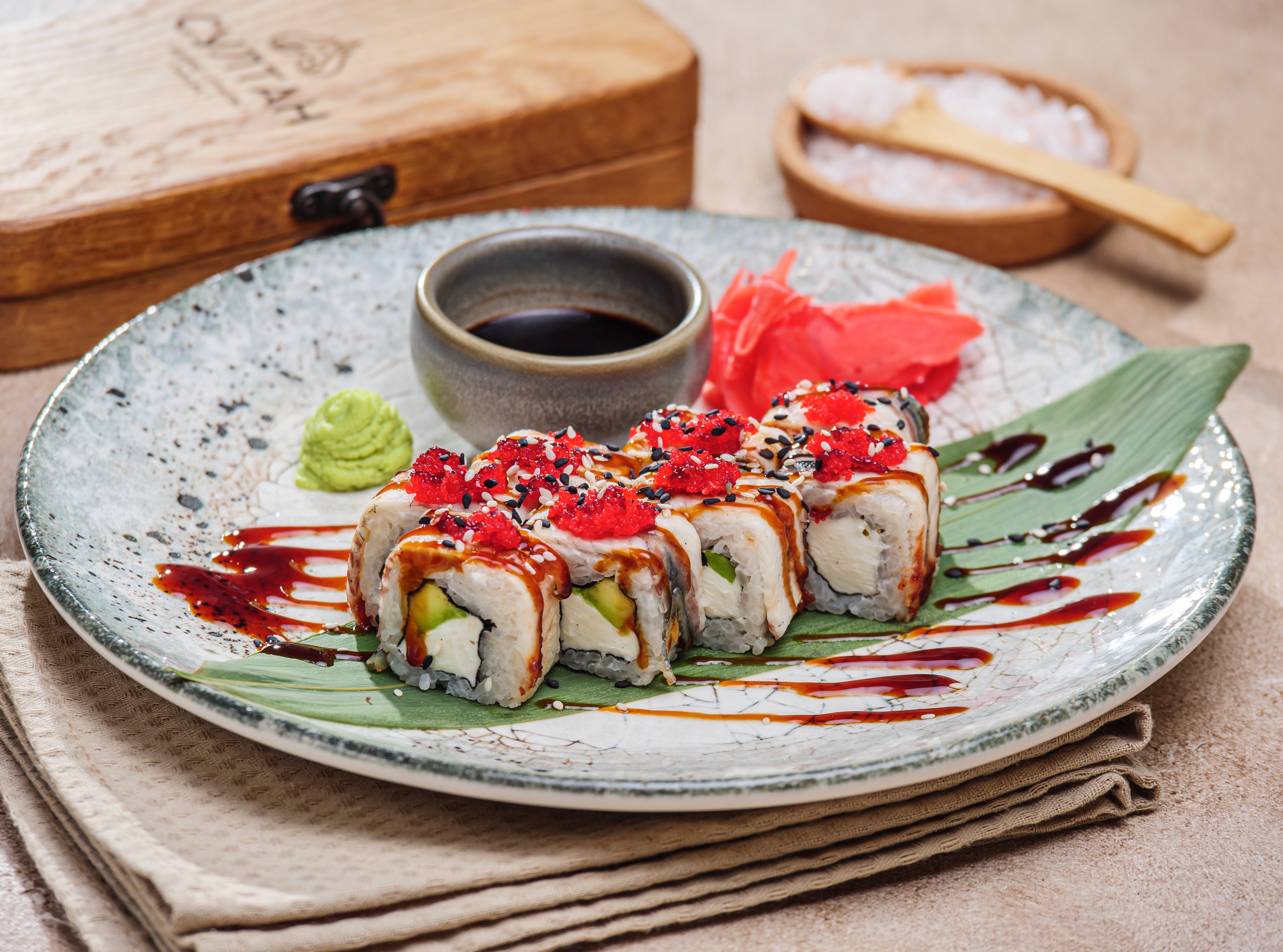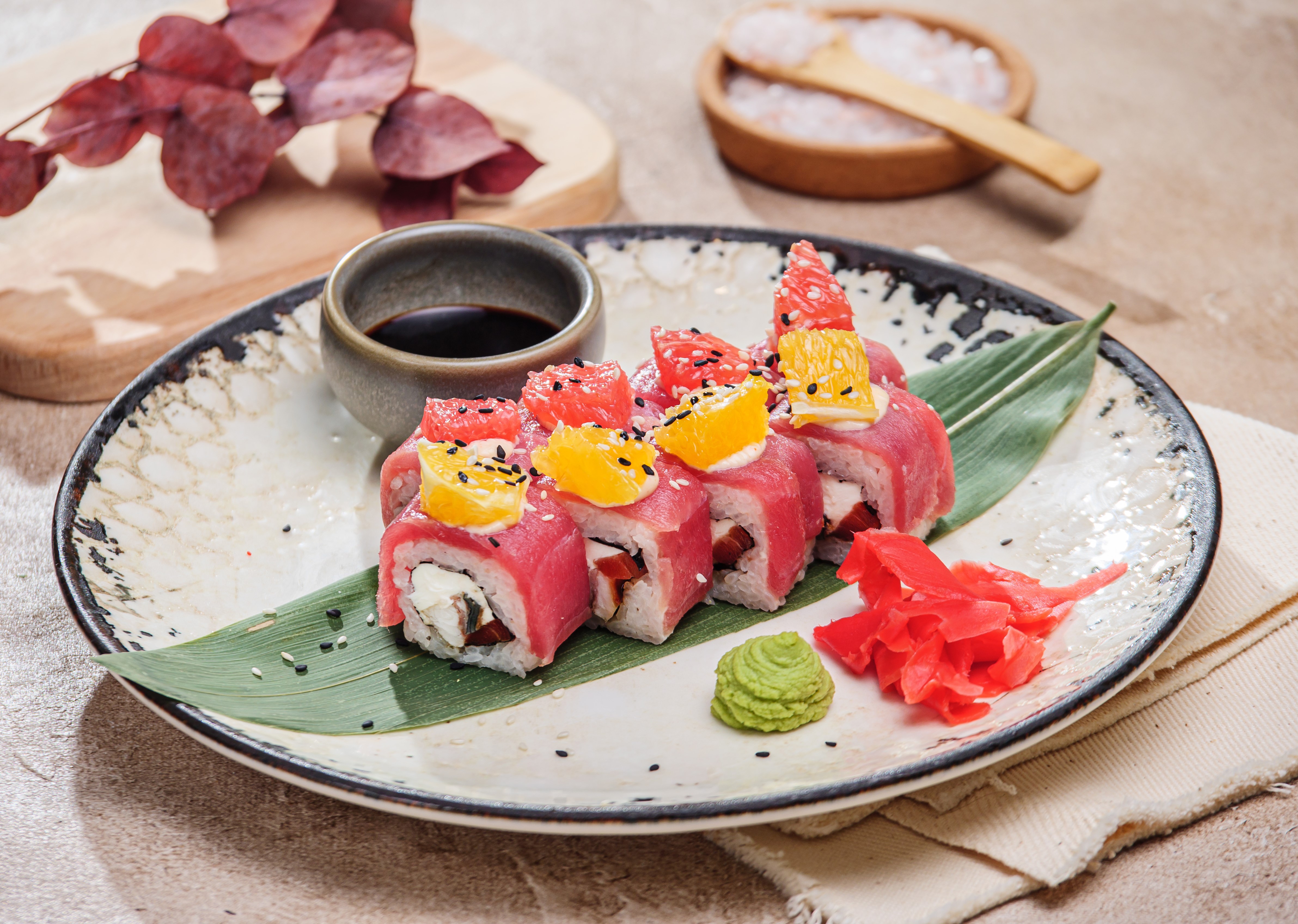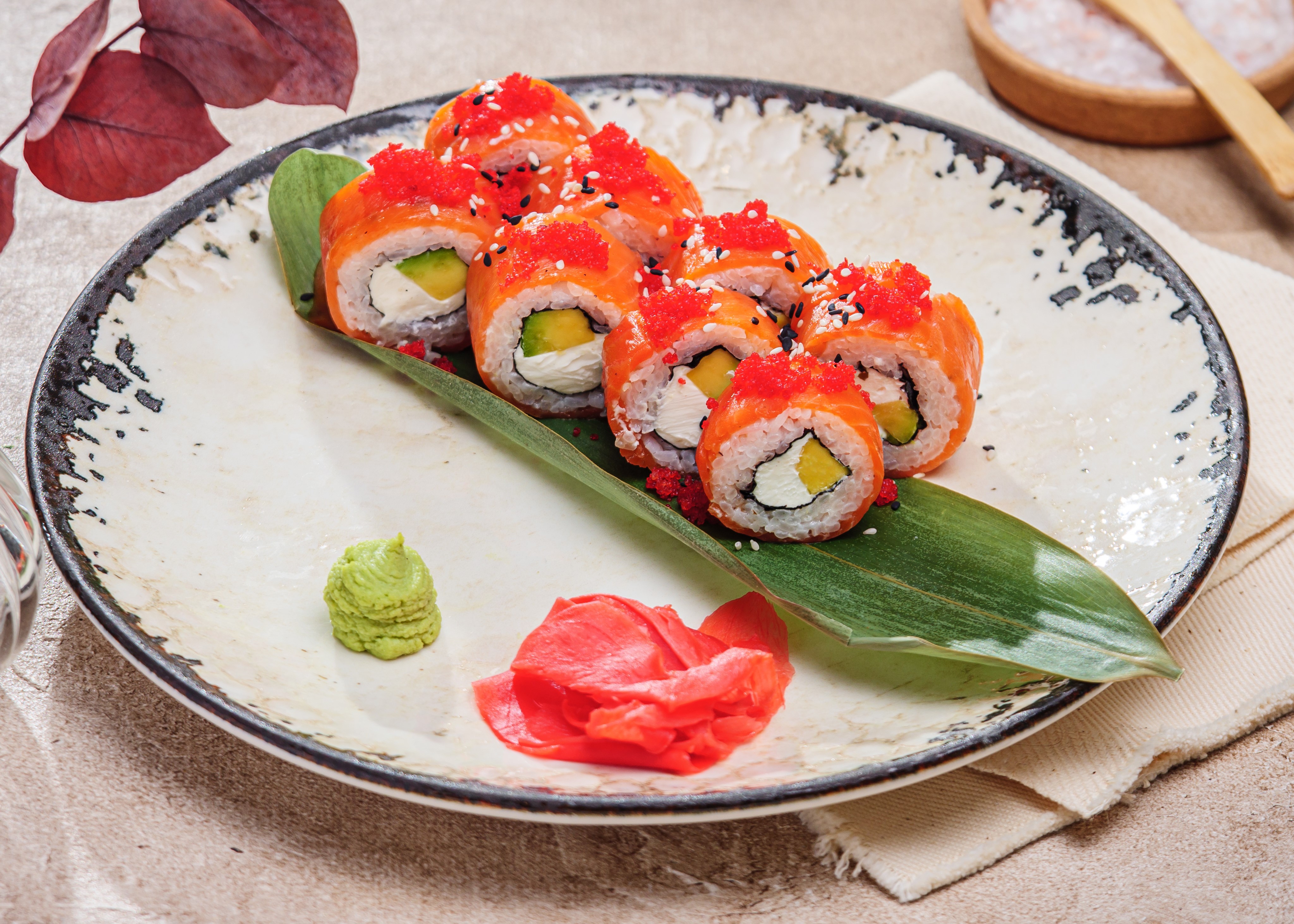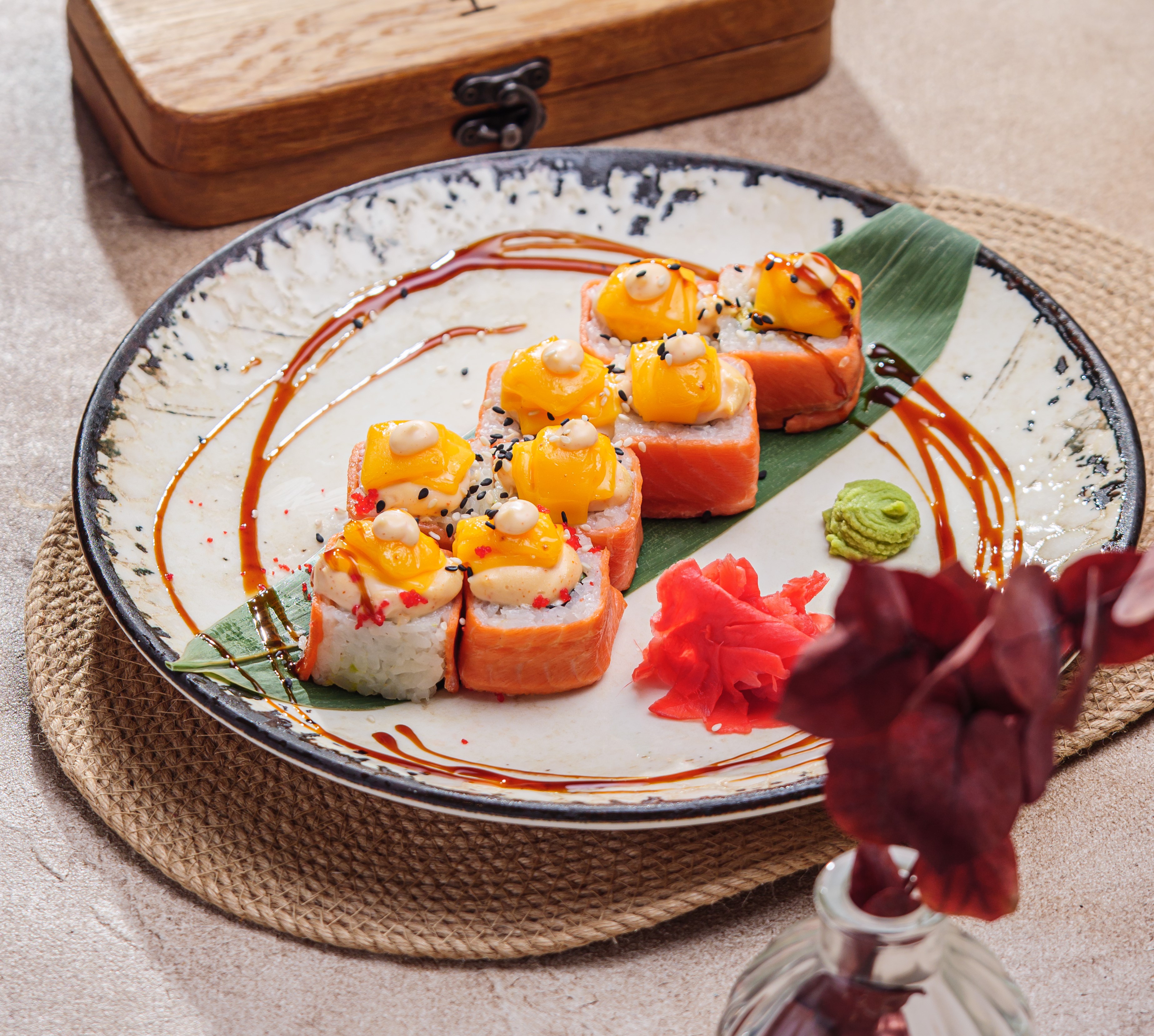 ростбиф из телятины, микс салата, сыр моцарелла, томаты черри, дайкон маринованный, фирменный соус