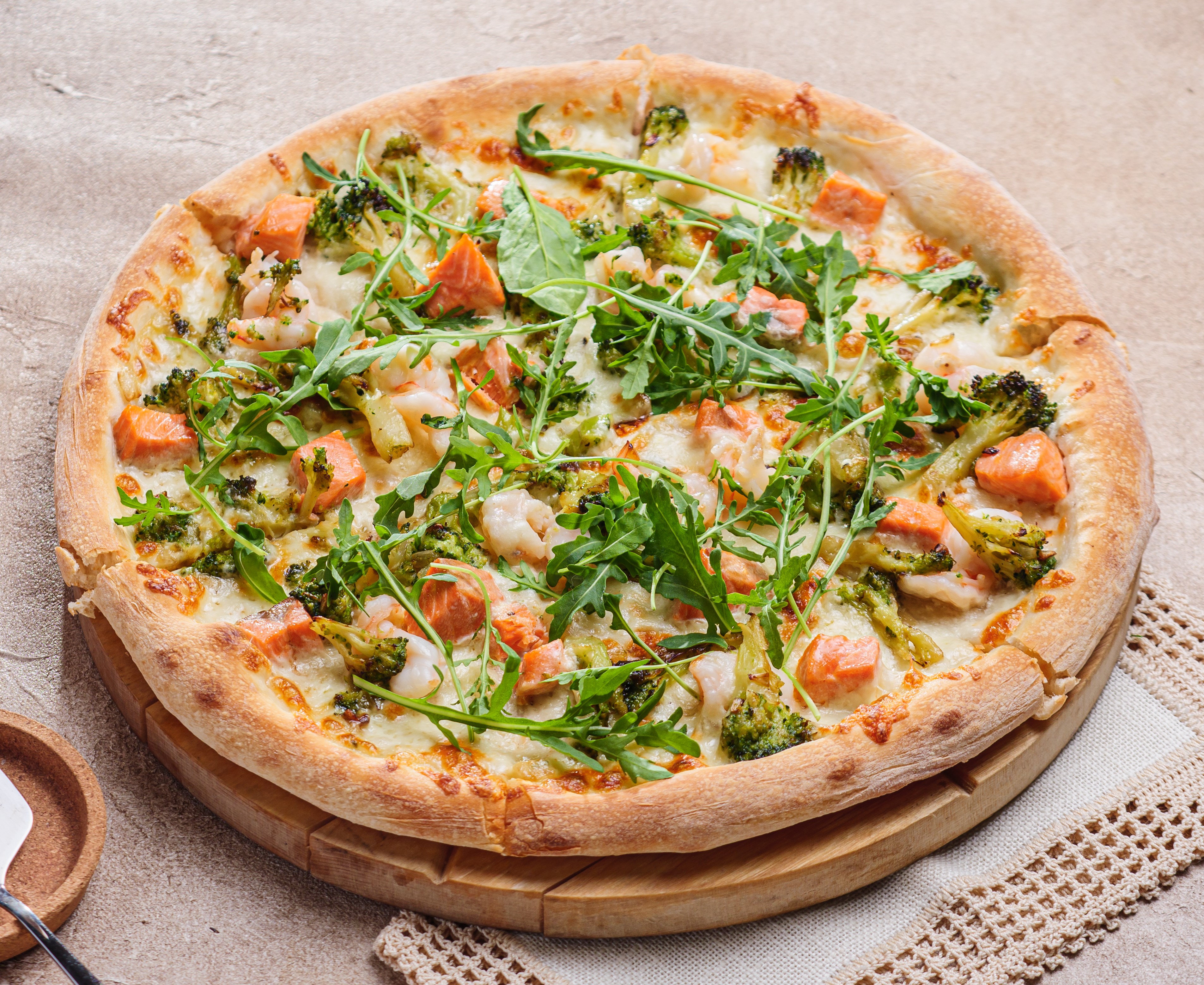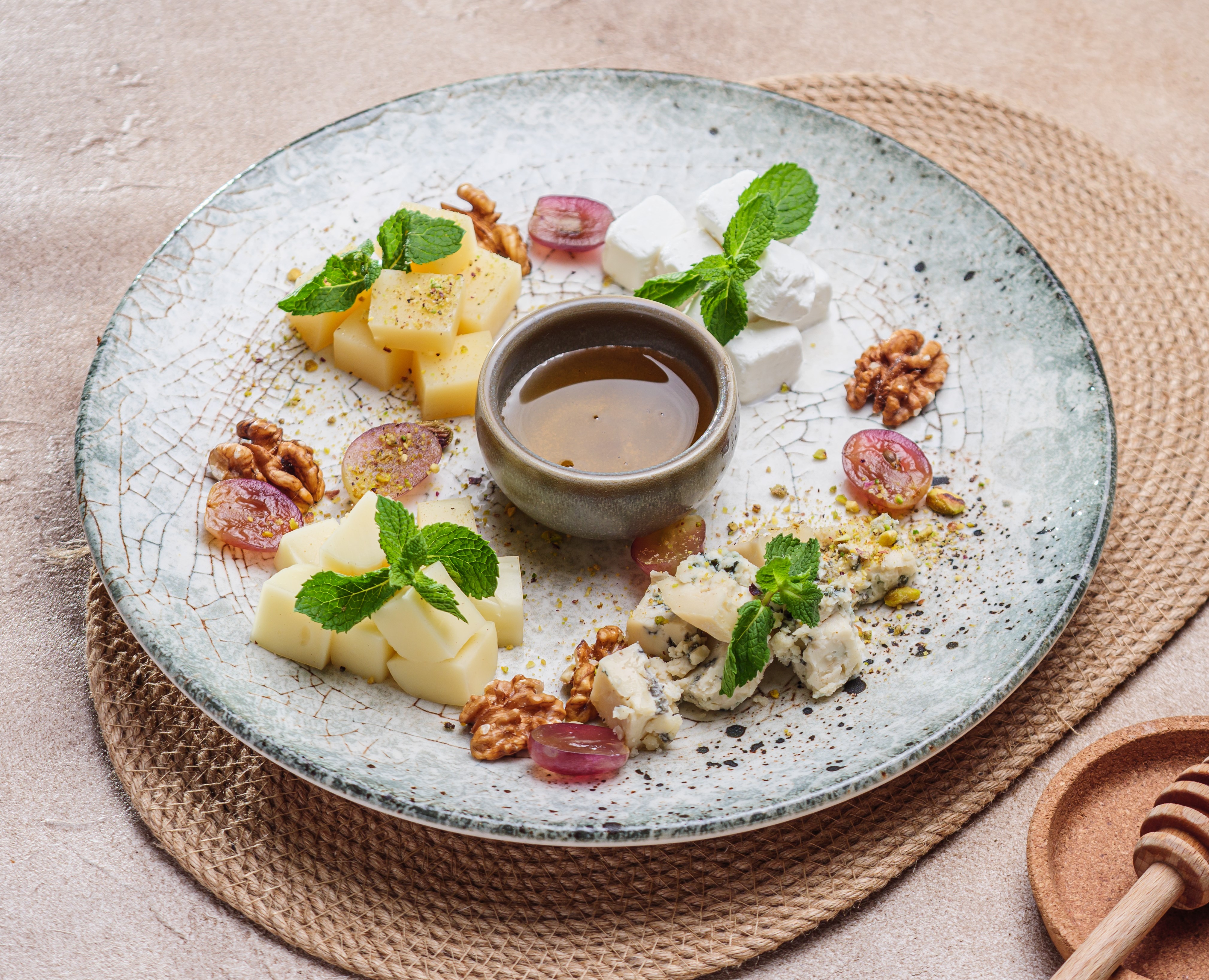 мидии, кальмар, креветки, сыр страчателла, оливки, дольки апельсина, медово-горчичный соус