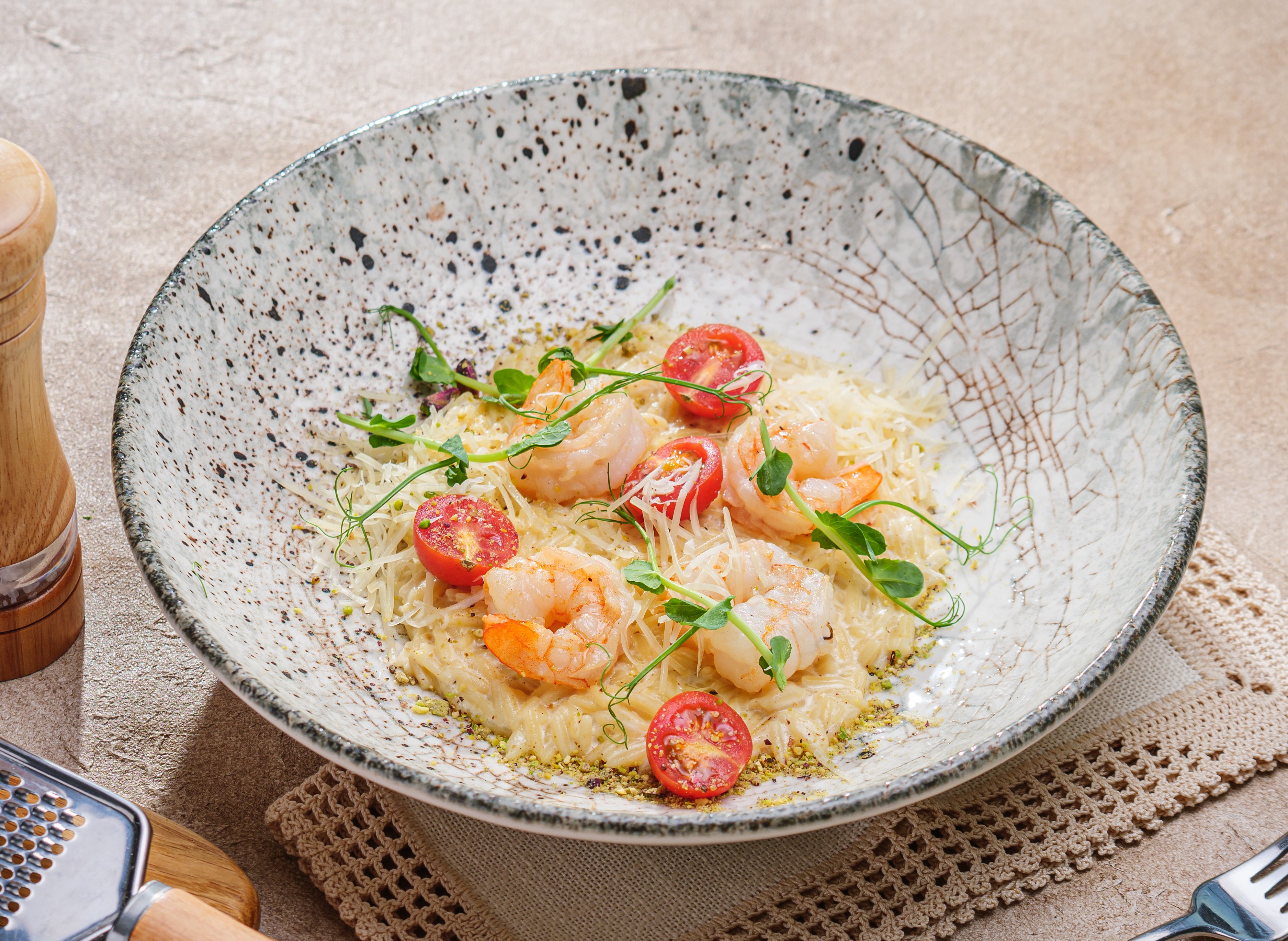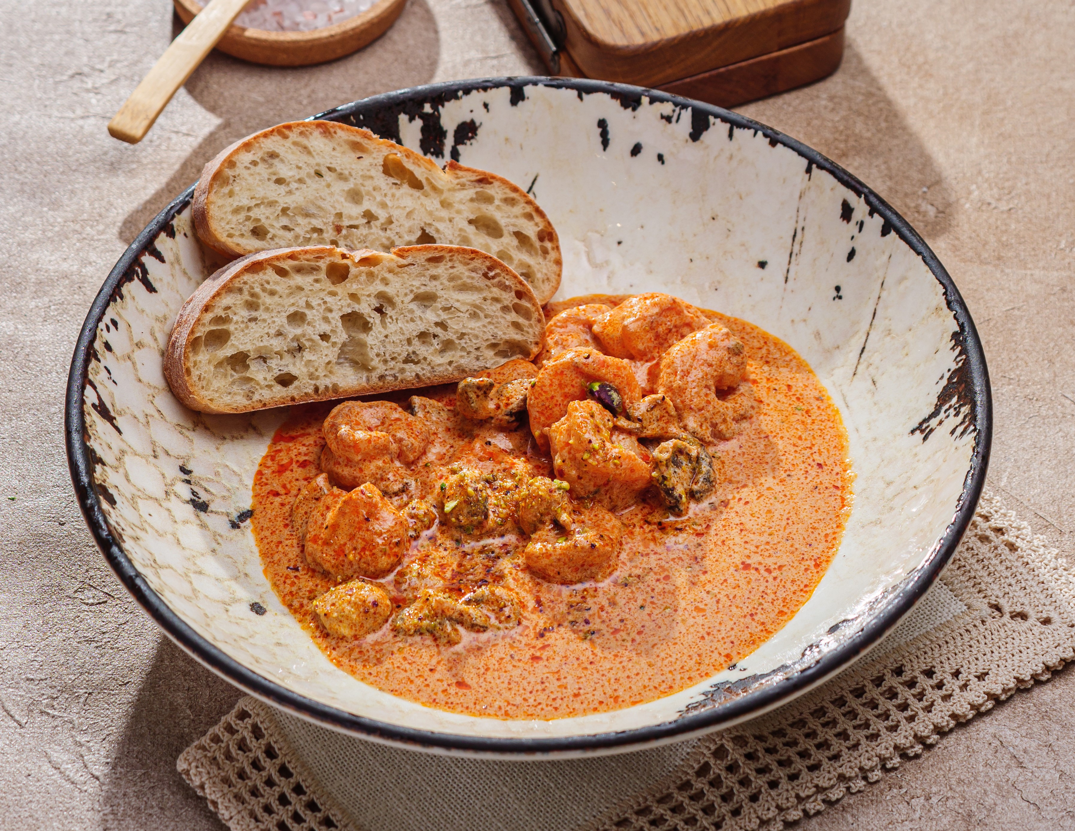 мидии, креветки, кальмар, кокосовое молоко, сливки, рис, долька лайма