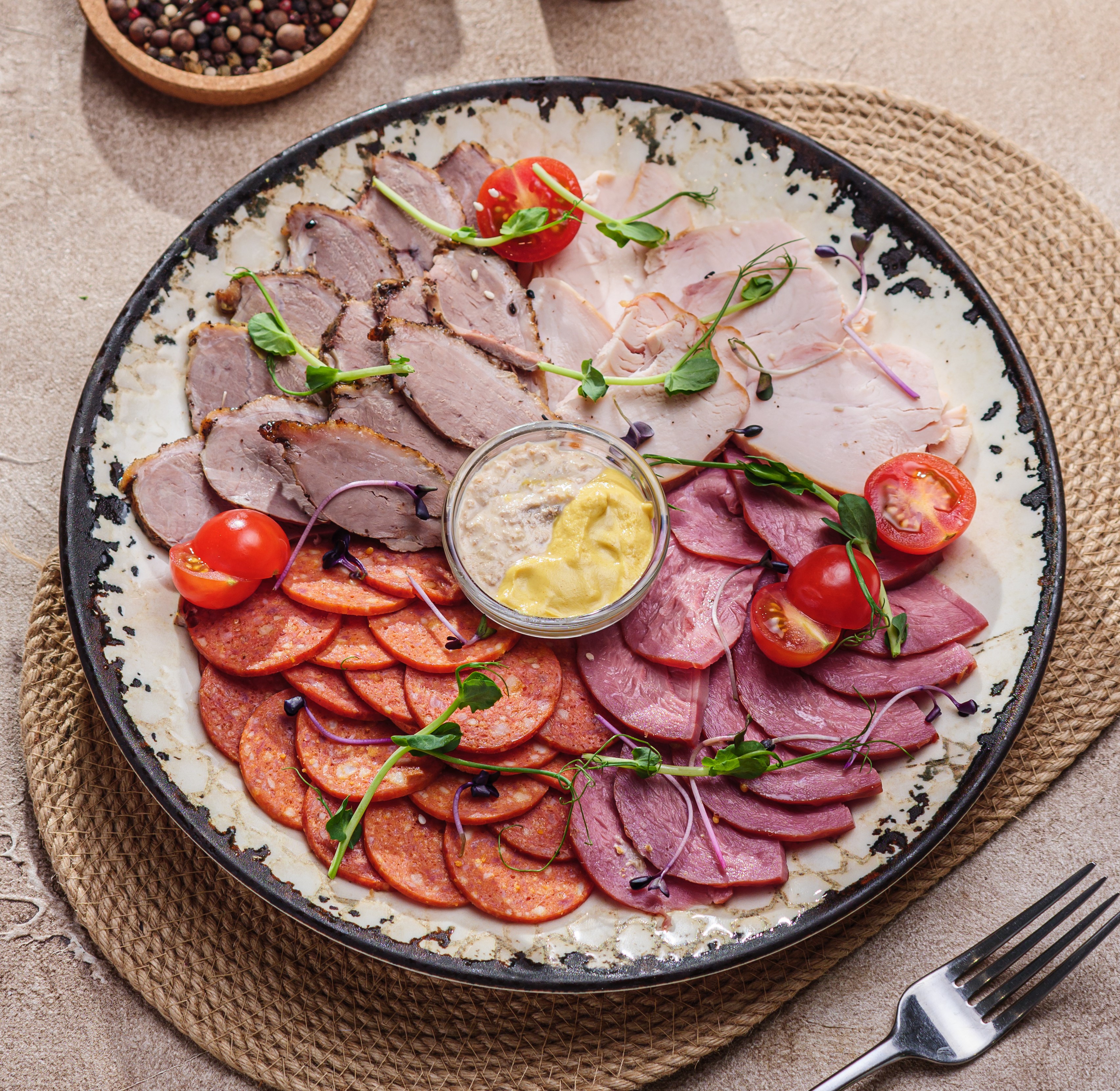 запечённая куриная грудка, колбаска из говядины, варёная колбаса, корнишоны, томаты, сыр моцарелла