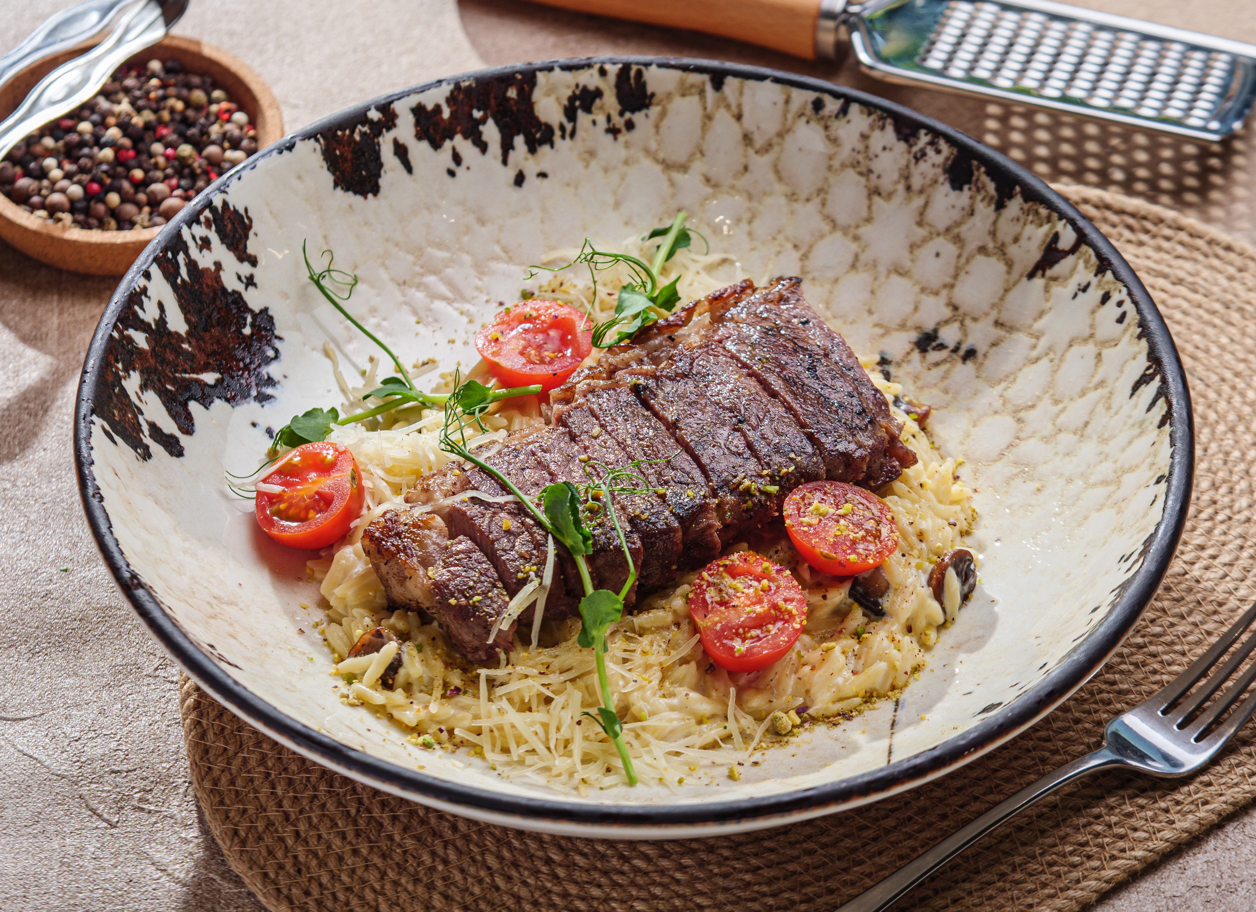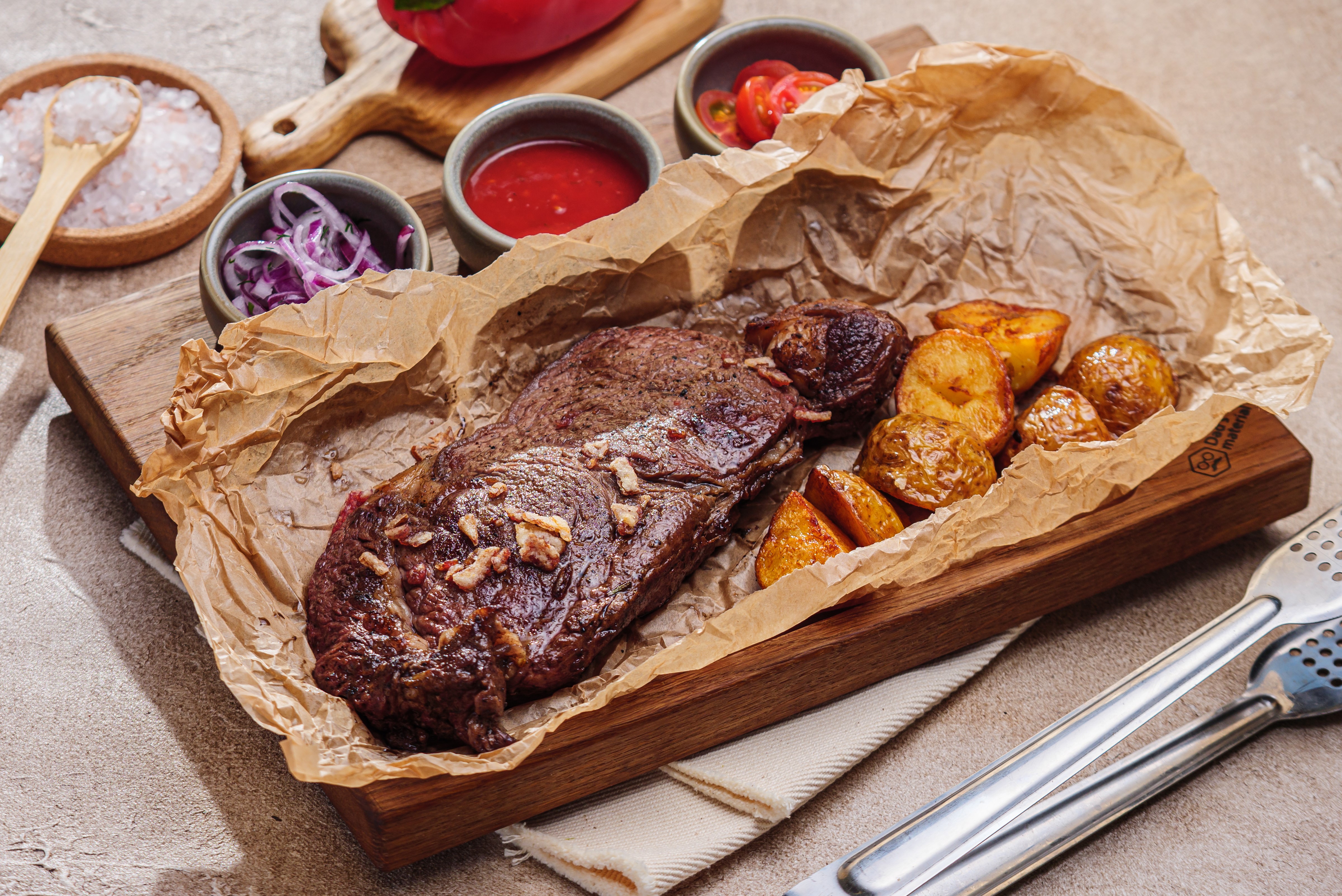 стейк рибай, кукуруза, лук красный, маринованный, томаты черри, томатный соус