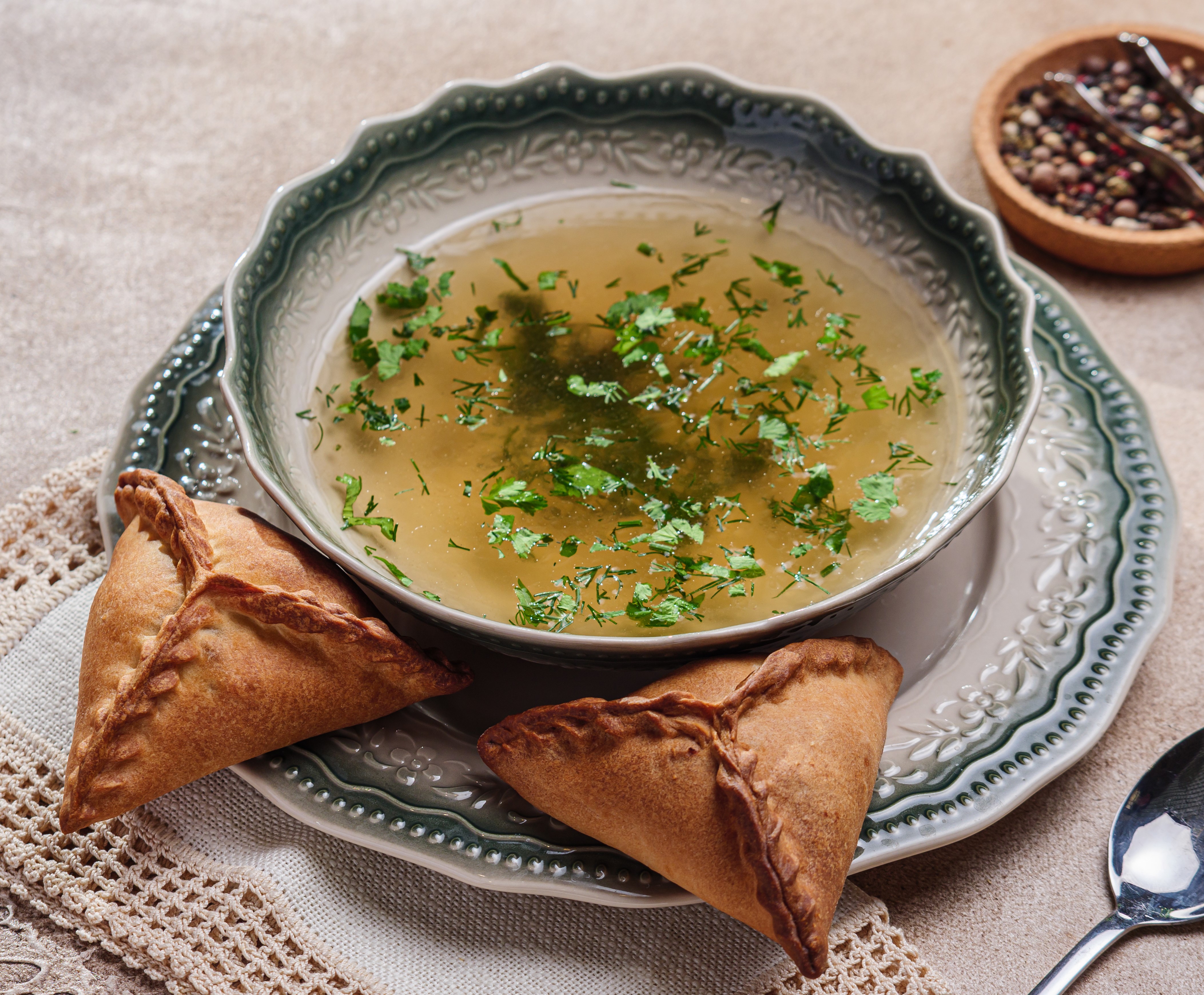 бульон куриный, лапша домашняя, куриное филе, пассировка, зелень
